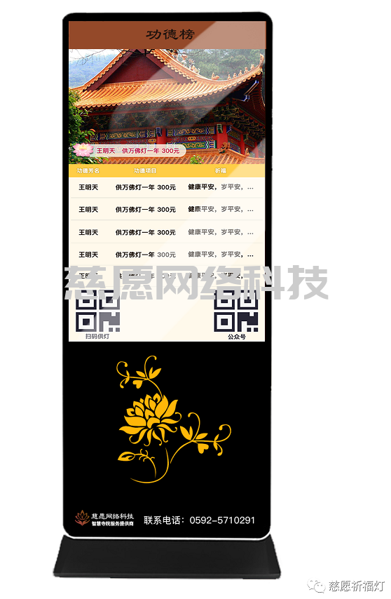 寺院捐贈系統(tǒng)中的供燈祈福模塊讓信眾通過微信公眾號、APP或觸摸屏、現場掃碼線上線下按天、按月、按年付費供燈,直播查看祈福信息。
